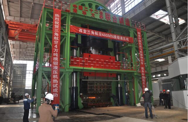 2012年3月3日,中國首臺40000噸級模鍛液壓機,在西安閻良三角航空科技有限責(zé)任公司進行熱試車,并順利鍛造出了大型盤類件產(chǎn)品。該機采用鋼絲纏繞預(yù)應(yīng)力結(jié)構(gòu)。