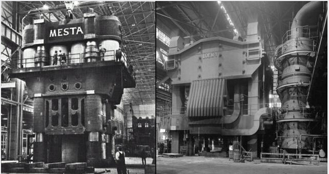 1955年,美國梅斯塔(MESTA)公司為美國鋁業(yè)公司克利夫蘭工廠制造4.5萬噸模鍛液壓機(左),和勞威公司(LOEWY)為Wyman-Gordon公司格拉夫頓鍛造廠制造的4.5萬噸模鍛液壓機 。